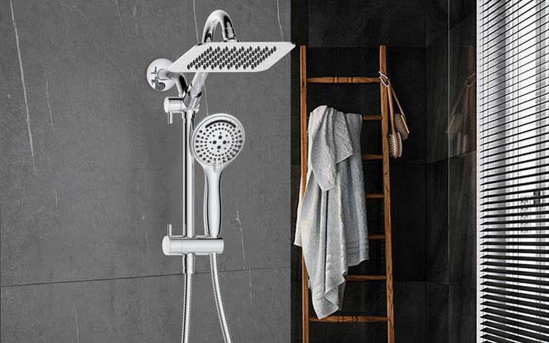 Upper water outlet elbow suit; The top spray has a built-in ball head, which can realize multi-angle rotation adjustment; Switch the handle to top spray water and shower water; Turn the handle to adjust the height of the sliding seat