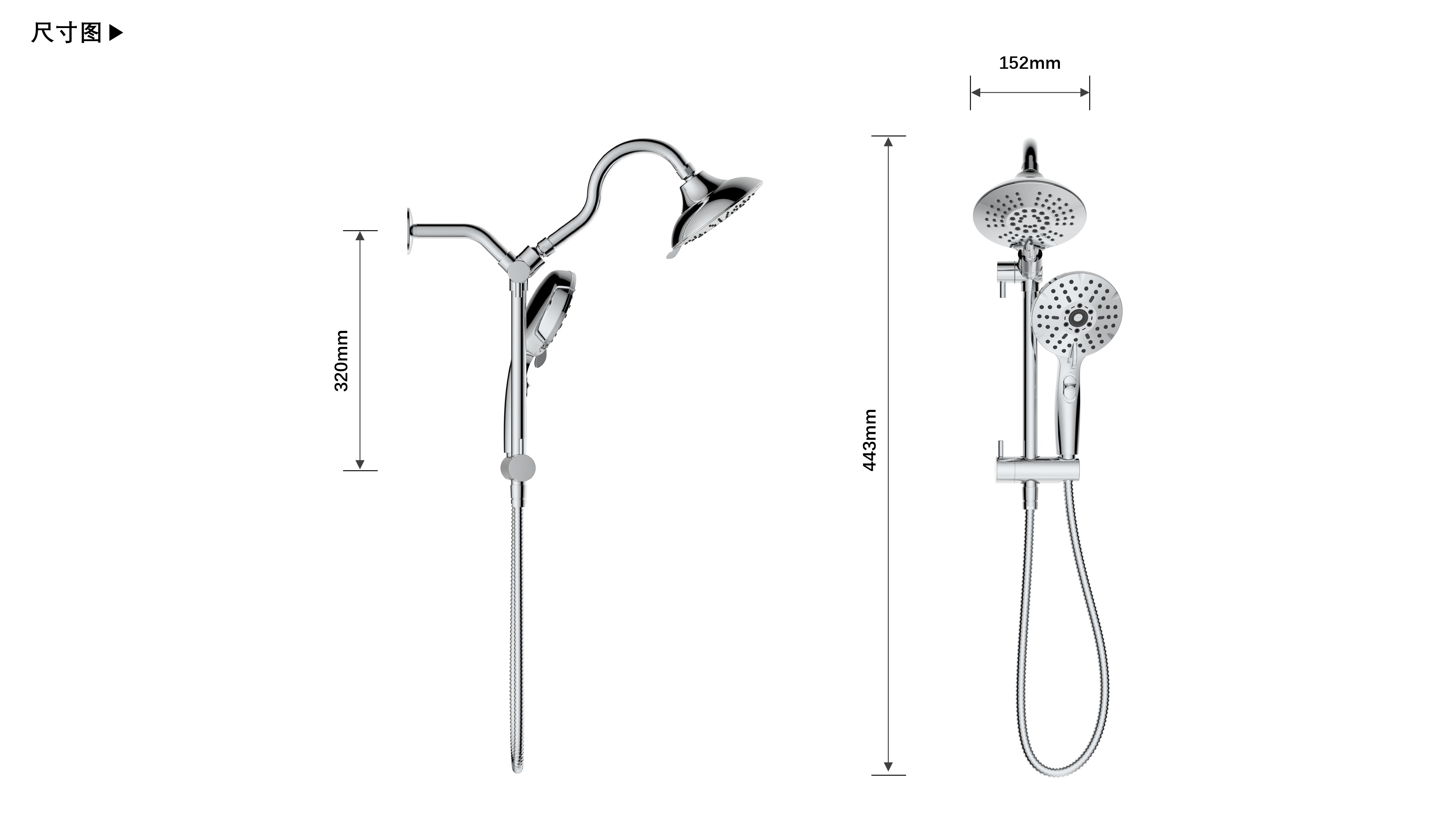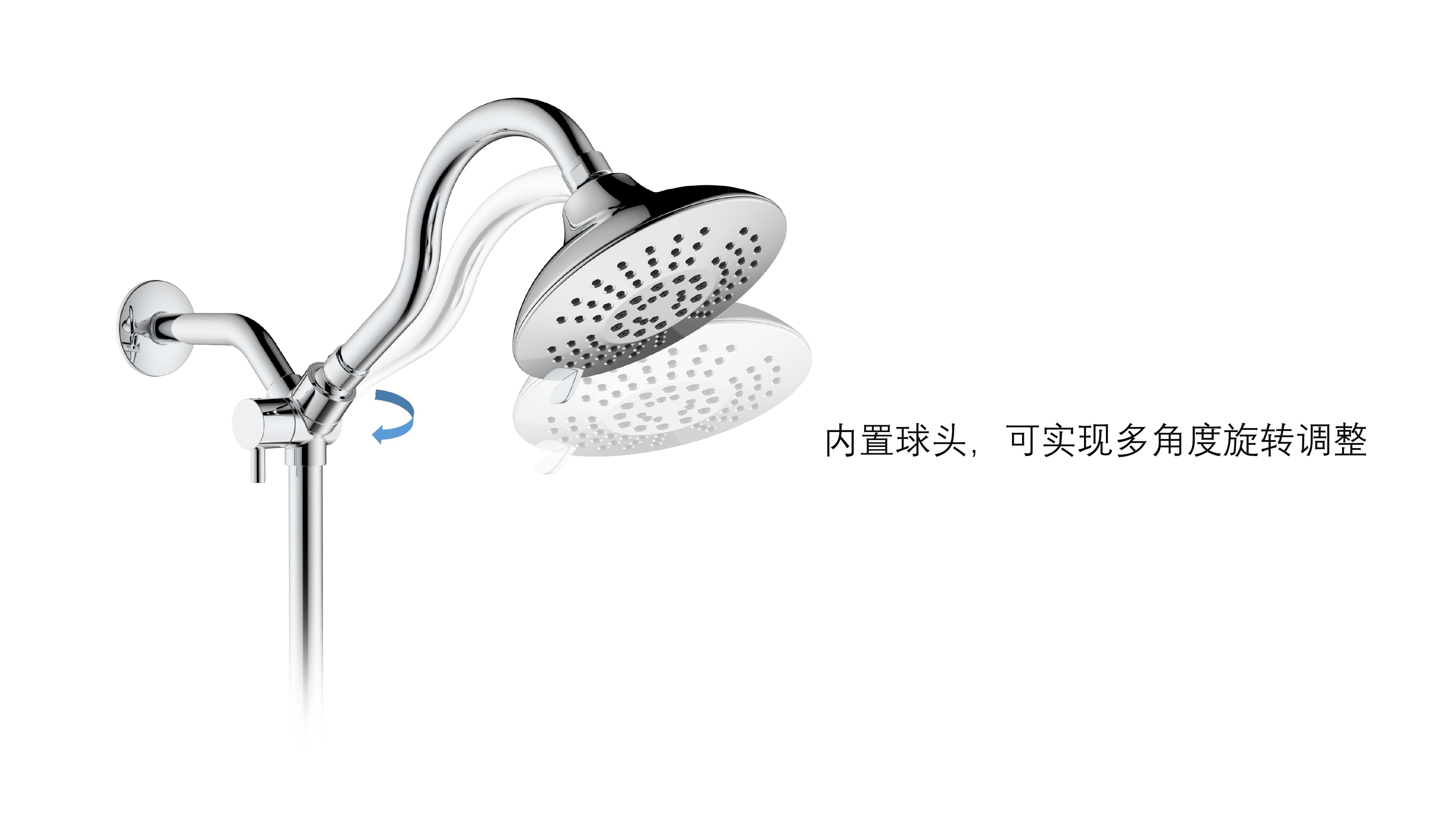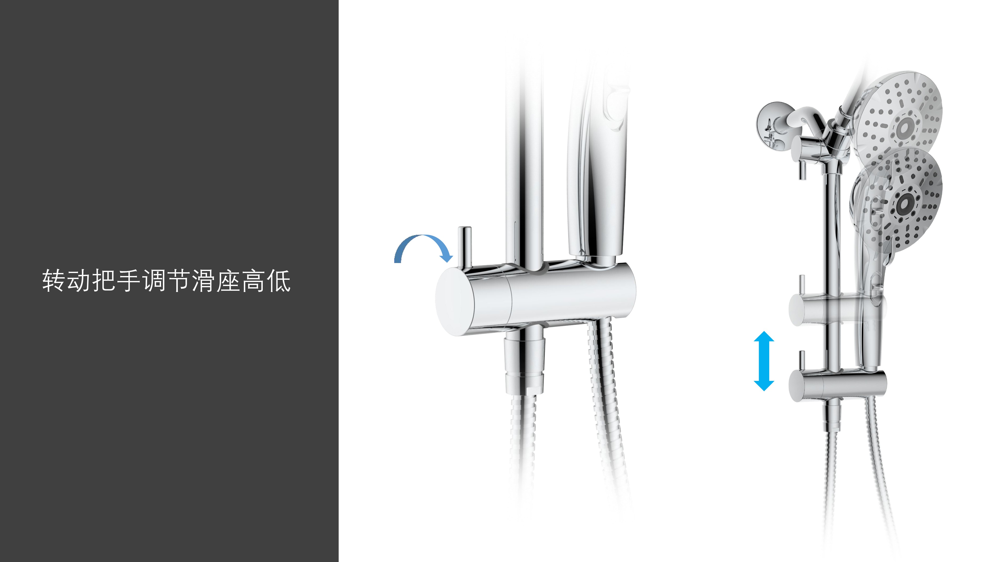上出水彎管套裝;頂噴內(nèi)置球頭,可實現(xiàn)多角度旋轉調(diào)整;把手切換頂噴出水、花灑出水;轉動把手調(diào)節(jié)滑座高低;5功能出水花灑
