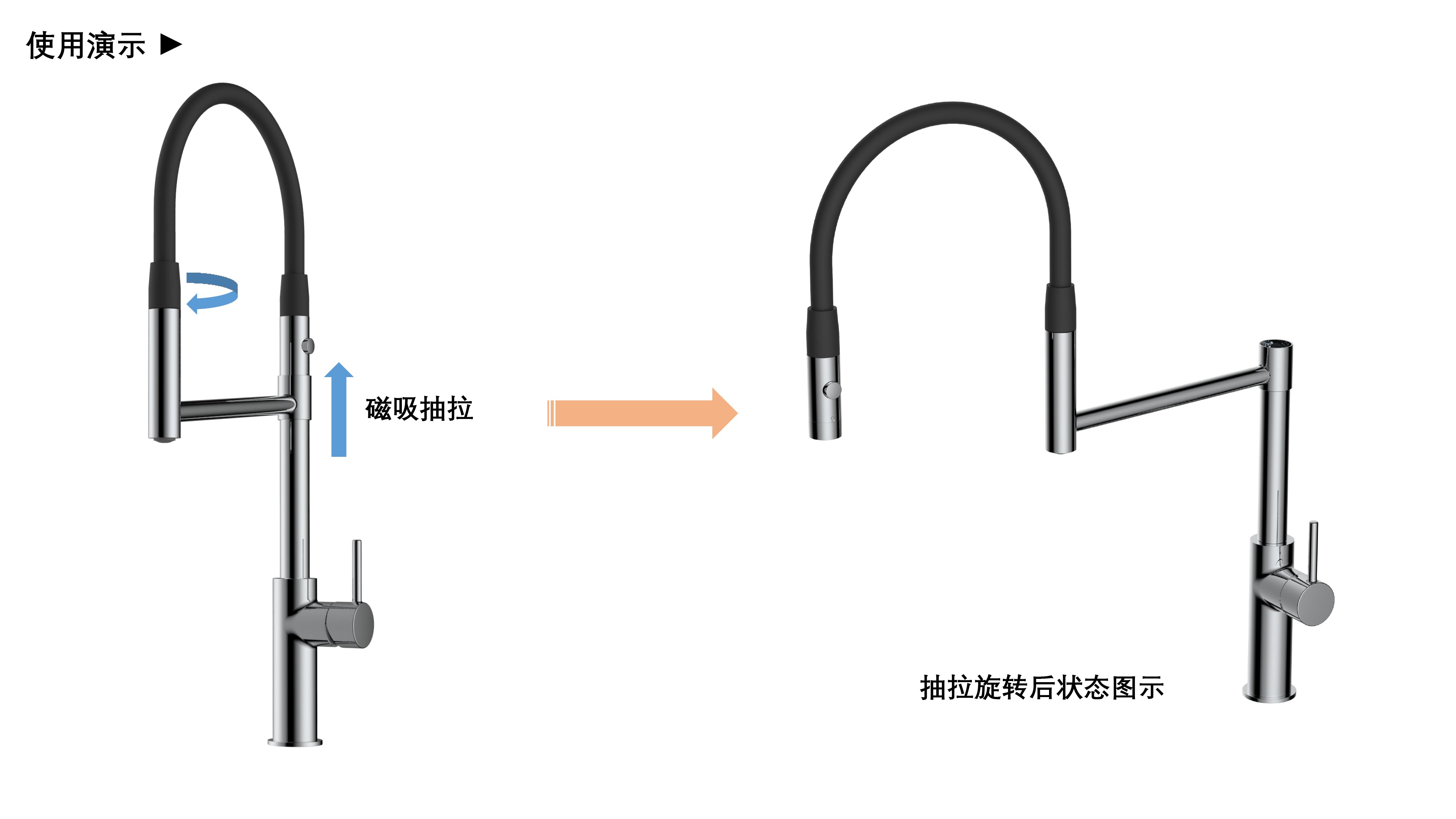 cUPC/ NSF61/ AB100/ NSF372/ Lead Free/ ADA認(rèn)證;磁吸抽拉廚房龍頭;磁吸抽拉頭可旋轉(zhuǎn)展開(kāi)使用,不用時(shí)旋轉(zhuǎn)回原位磁吸固定;兩種出水可根據(jù)需求切換
